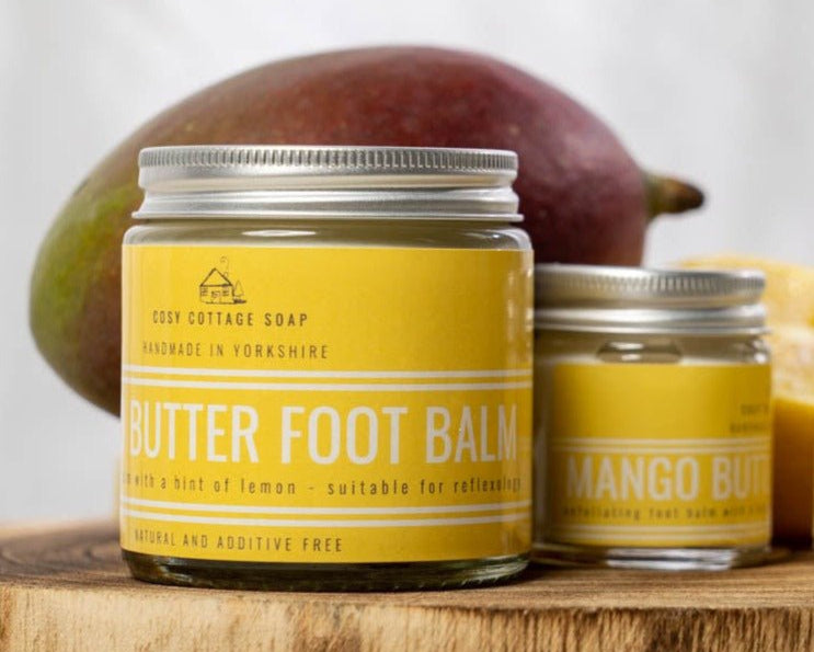 A luxurious, vegan and intensely moisturising foot balm made with mango butter, coconut oil, aloe vera and lemon oil. Specially created to smooth troublesome, dry feet. This balm has a slightly exfoliating texture due to the presence of natural sugar crystals within the mango butter. These crystals will dissolve as the product is massaged into your skin.