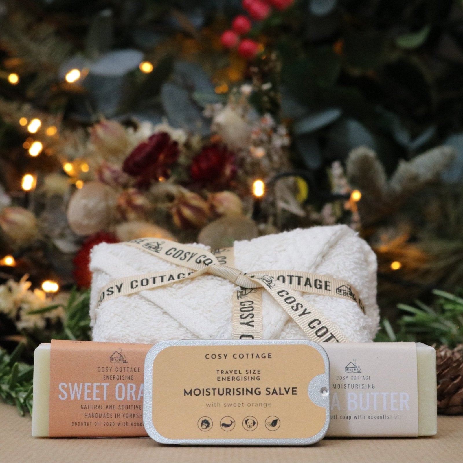 These hand-tied bundles are wrapped in one of our popular, super soft organic cotton face cloths and contain two 15g soaps in our popular sweet orange and moisturising shea butter options. The shea butter soap, suitable for use on the face, has a gentle hint of sweet orange fragrance. There is also a choice of lavender, sweet orange or geranium quick-fix salves.