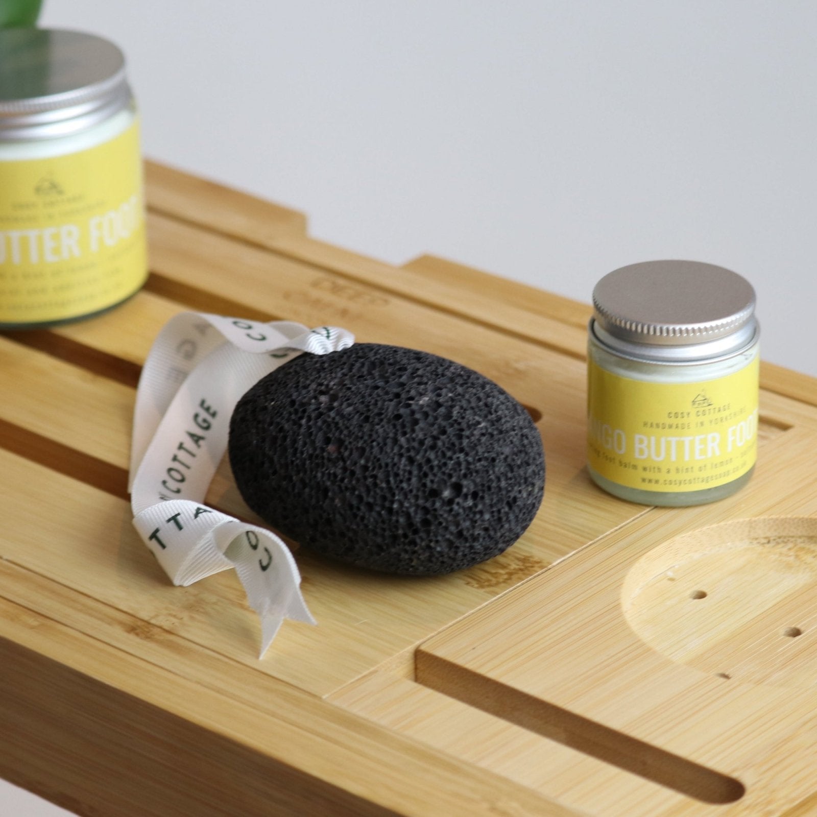 The attractive olive wood nailbrush energises while it cleanses, smooths and readies toenails for a pedicure if required. Use the pumice stone to remove hard skin on heels, pop on the washable and resuable bamboo socks and leave our balm to do its work for twenty minutes or so for a really deep moisturising drench effect.