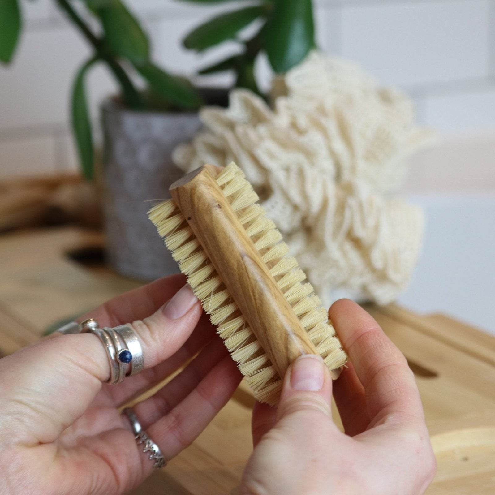 An olive wood nailbrush with natural plant derived bristles