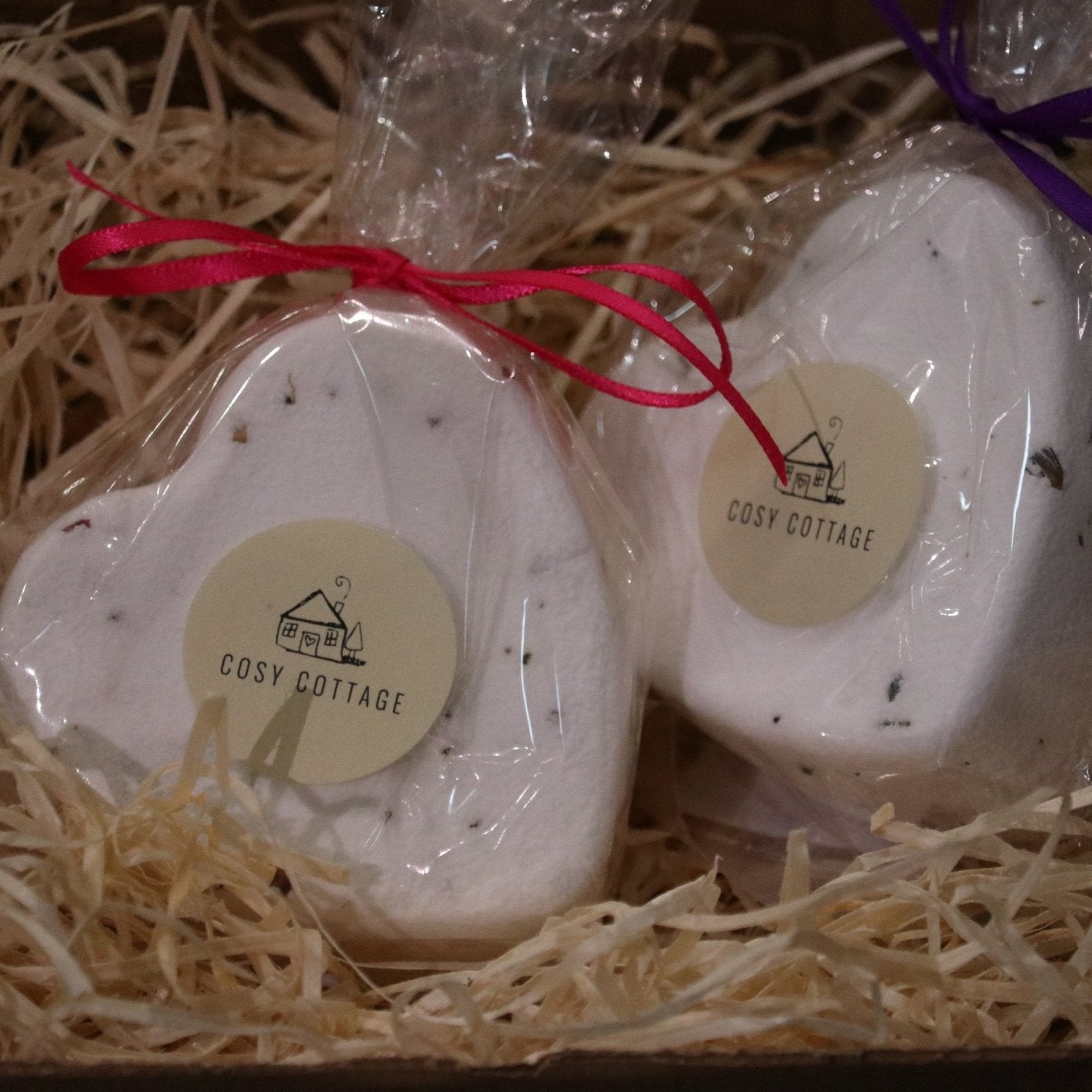 Each bath bomb is presented in a compostable, ribbon tied bag.